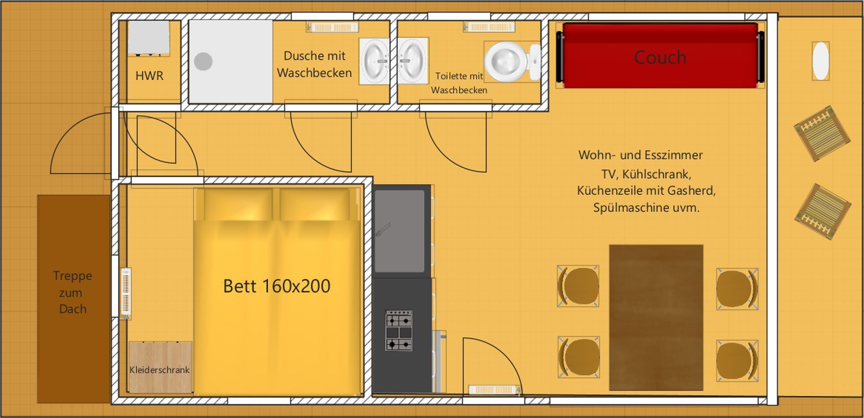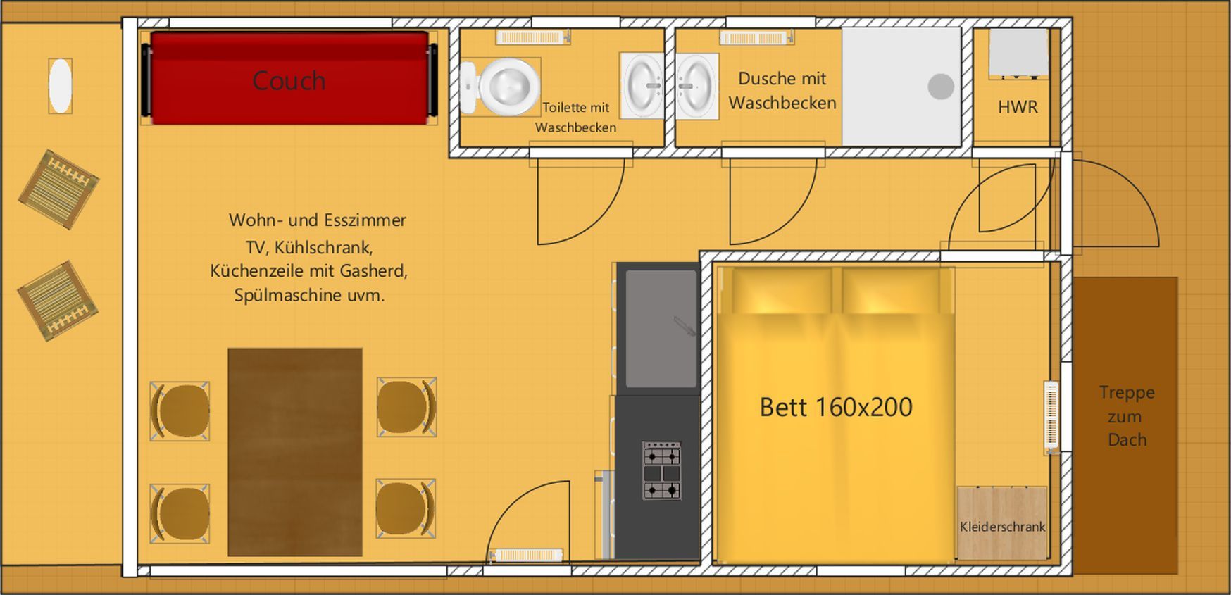 * Wohn- und Essbereich mit Couch, Esstisch mit 4 Stühlen
